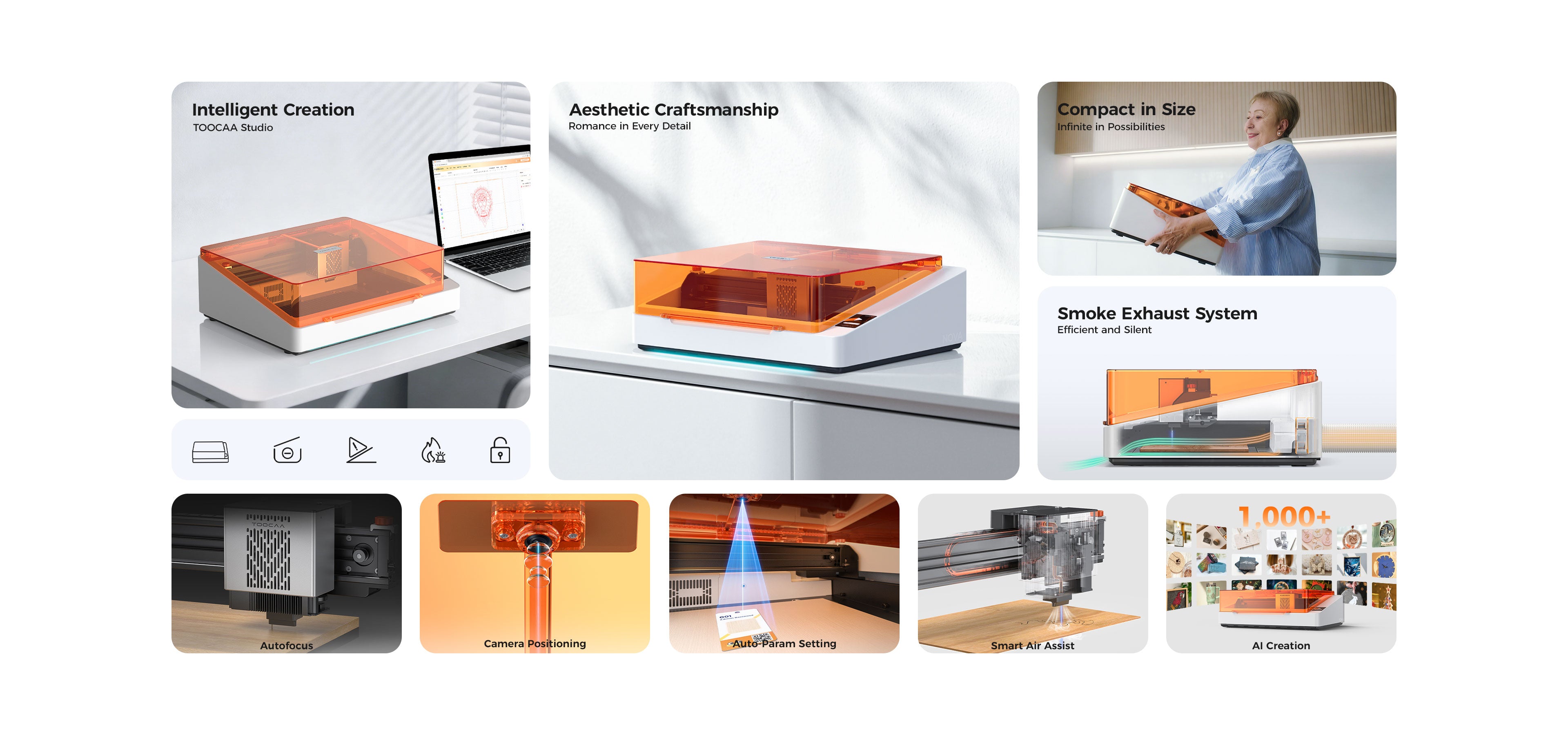 Le TOOCAA NOVA n’est pas un simple graveur — il intègre intelligence artificielle, guidage caméra et automatisation intelligente, ce qui en fait une solution de choix pour tous niveaux d’utilisateurs, du novice à l’expert. Avec performances élevées, sécurité renforcée et polyvalence maximale, il permettra de réaliser plus rapidement vos projets créatifs et professionnels.